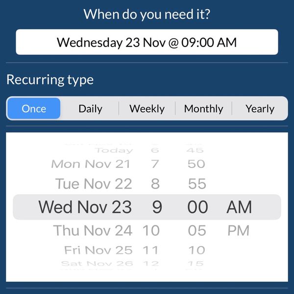 [Pro Feature] Create or edit an item, then press the "When" button, which will bring you to the scheduling page. Simply choose from "Daily", "Weekly", "Monthly", or "Yearly" and then set your date and time!