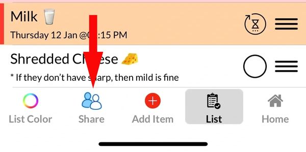 From the list that you want to share with other people, simply click the "Share" button on the bottom of the screen. From the "Share" page, simply select the mobile numbers of the users you want to share with from your contacts. The list is instantly shared and the user will receive a text letting them know!