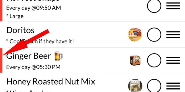 A vertical red line on the left side of an item means that the item is either expiring soon, or has expired.